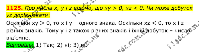Про числа х, у і z відомо, що ху > 0, хz < 0. Чи може добуток уz дорівнювати: Оскільки ху > 0, то х і у – одного знака. Оскільки хz < 0, то х і z – різних знаків. Тому у і z також різних знаків і їхній добуток – число від’ємне. Відповідь: 1) Так; 2) ні; 3) ні.