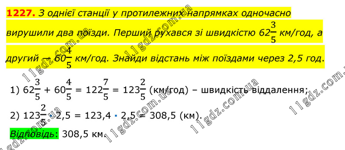 З однієї станції у протилежних напрямках одночасно вирушили два поїзди. Перший рухався зі швидкістю 623/5 км/год, а другий — 604/5 км/год. Знайди відстань між поїздами через 2,5 год. 1) 623/5 + 604/5 = 1227/5 = 1232/5 (км/год) – швидкість віддалення; 2) 1232/5 · 2,5 = 123,4 · 2,5 = 308,5 (км). Відповідь: 308,5 км.