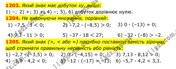 1203. Який знак має добуток ху, якщо: 1) –; 2) +; 3) +; 4) –; 5), 6) добуток дорівнює нулю. 1204. He виконуючи множення, порівняй: 1) –7,5 · 3 < 0; 2) –7,2 · (–8,5) > 0; 3) 0 · (–13) = 0; 4) 9,3 · 11 > 0; 5) –37 · 18 < 27; 6) –32 · (–8) > –2. 1205. Який знак (>, < або =) потрібно поставити замість зірочки, щоб отримати правильну нерівність або рівність: 1) –2,7 · (–3,5) > 0; 2) 0 · (–4,15) = 0; 3) 7,13 · 8,12 > 0; 4) –5,9 · 4,2 < 0; 5) –12 · (–17) > –13; 6) –5,7 · 4,2 < 3,1.