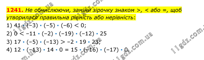 He обчислюючи, заміни зірочку знаком >, < або =, щоб утворилася правильна рівність або нерівність: 1) 41 · (–3) · (–5) · (–6) < 0; 2) 0 < –11 · (–2) · (–19) · (–12) · 25 3) 17 · (–5) · (–13) > –2 · 19 · 23; 4) 12 · (–13) · 14 · 0 = 15 · (–16) ∙ (–17) · 0.