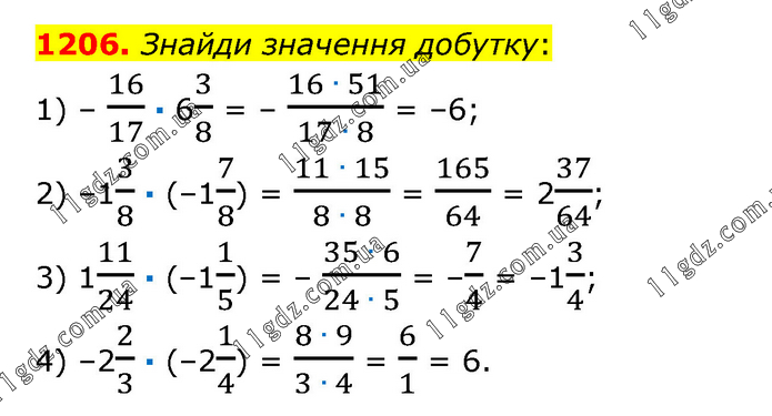 Знайди значення добутку: 1) – 16/17 · 63/8 = – (16 ∙ 51)/(17 ∙ 8) = –6; 2) –13/8 · (–17/8) = (11 ∙ 15)/(8 ∙ 8) = 165/64 = 237/64; 3) 111/24 · (–11/5) = – (35 ∙ 6)/(24 ∙ 5) = –7/4 = –13/4; 4) –22/3 · (–21/4) = (8 ∙ 9)/(3 ∙ 4) = 6/1 = 6.
