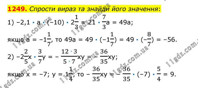 Спрости вираз та знайди його значення: 1) –2,1 · а · (–10) · 21/3 = 21 · 7/3а = 49а; якщо а = –11/7, то 49а = 49 · (–11/7) = 49 · (–8/7) = –56. 2) –22/5х · 3/7у = – (12 ∙ 3)/(5 ∙ 7)ху = – 36/35ху; якщо х = –7; у = 11/4, то – 36/35ху = – 36/35 · (–7) · 5/4 = 9.