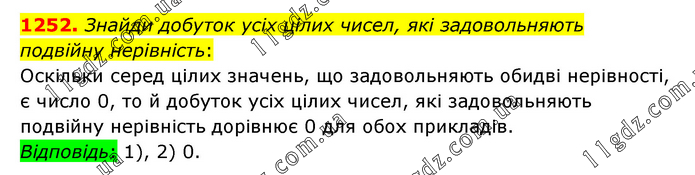 Знайди добуток усіх цілих чисел, які задовольняють подвійну нерівність: Оскільки серед цілих значень, що задовольняють обидві нерівності, є число 0, то й добуток усіх цілих чисел, які задовольняють подвійну нерівність дорівнює 0 для обох прикладів. Відповідь: 1), 2) 0.