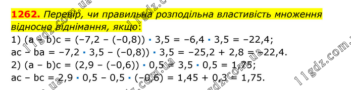 Перевір, чи правильна розподільна властивість множення відносно віднімання, якщо: 1) (a – b)c = (–7,2 – (–0,8)) · 3,5 = –6,4 · 3,5 = –22,4; ac – ba = –7,2 · 3,5 – (–0,8)) · 3,5 = –25,2 + 2,8 = –22,4. 2) (a – b)c = (2,9 – (–0,6)) · 0,5 = 3,5 · 0,5 = 1,75; ac – bc = 2,9 · 0,5 – 0,5 · (–0,6) = 1,45 + 0,3 = 1,75.