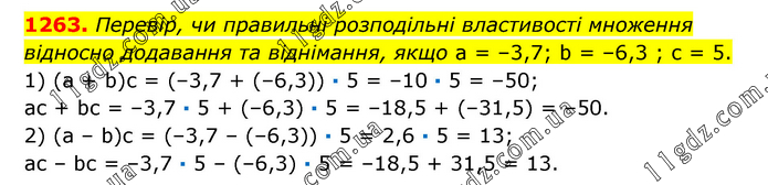 Перевір, чи правильні розподільні властивості множення відносно додавання та віднімання, якщо а = –3,7; b = –6,3 ; с = 5. 1) (a + b)c = (–3,7 + (–6,3)) · 5 = –10 · 5 = –50; ac + bc = –3,7 · 5 + (–6,3) · 5 = –18,5 + (–31,5) = –50. 2) (a – b)c = (–3,7 – (–6,3)) · 5 = 2,6 · 5 = 13; ac – bc = –3,7 · 5 – (–6,3) · 5 = –18,5 + 31,5 = 13.