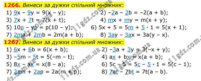 1266. Винеси за дужки спільний множник: 1) 9х – 9у = 9(х – у); 2) –2a – 2b = –2(a + b); 3) 7x + 7t = 7(x + t); 4) mх + mу = m(х + у); 5) 10р – yр = р(10 – y); 6) 5х + 5 = 5m + 5 · 1 = 5(х + 1); 7) 2ma + 2mb = 2m(a + b); 8) 3aу – 3ax = 3a(у – x). 1267. Винеси за дужки спільний множник: 1) 6x + 6b = 6(x + b); 2) –3a + 3y = 3(–x + y); 3) –5m – 5t = 5(–m – t); 4) ax + bx = x(a + b); 5) 8x – ax = x(8 – a); 6) 5c – 5 = 5c – 5 · 1 = 5(c – 1); 7) 2am + 2ap = 2a(m + p); 8) 7at – 7bt = 7t(a – b).
