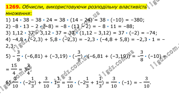 Обчисли, використовуючи розподільну властивість множення: 1) 14 · 38 – 38 · 24 = 38 · (14 – 24) = 38 · (–10) = –380; 2) –8 · 13 – 2 · (–8) = –8 · (13 – 2) = – 8 · 11 = –88; 3) 1,12 · 37 – 3,12 · 37 = 37 · (1,12 – 3,12) = 37 · (–2) = –74; 4) –4,8 · (–2,3) + 5,8 · (–2,3) = –2,3 · (–4,8 + 5,8) = –2,3 · 1 = –2,3; 5) – 3/8 · (–6,81) + (–3,19) · (–3/8) · (–6,81 + (–3,19)) = –3/8 · (–10) = = 15/4 = 33/4; 6) 3/10 · (–21/3) + 3/10 · 11/3 = 3/10 · (–21/3 + 11/3) = 3/10 · (–1) = – 3/10.