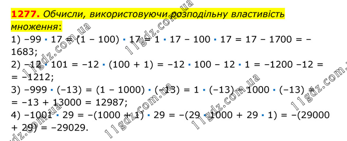 Обчисли, використовуючи розподільну властивість множення: 1) –99 · 17 = (1 – 100) · 17 = 1 · 17 – 100 · 17 = 17 – 1700 = –1683; 2) –12 · 101 = –12 · (100 + 1) = –12 · 100 – 12 · 1 = –1200 –12 = = –1212; 3) –999 · (–13) = (1 – 1000) · (–13) = 1 · (–13) – 1000 · (–13) = = –13 + 13000 = 12987; 4) –1001 · 29 = –(1000 + 1) · 29 = –(29 · 1000 + 29 · 1) = –(29000 + 29) = –29029.