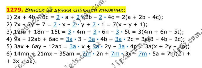 Винеси за дужки спільний множник: 1) 2a + 4b – 8c = 2 · a + 2 · 2b – 2 · 4c = 2(a + 2b – 4c); 2) 7x – 7y + 7 = 7 · x – 7 · y + 7 · 1 = 7(x – y + 1); 3) 12m + 18n – 15t = 3 · 4m + 3 · 6n – 3 · 5t = 3(4m + 6n – 5t); 4) 9a – 12ab + 6ac = 3a · 3 – 3a · 4b + 3a · 2c = 3a(3 – 4b – 2c); 5) 3ax + 6ay – 12ap = 3a · x + 3a · 2y – 3a · 4p = 3a(x + 2y – 4p); 6) 14mn + 21mx – 35am = 7m · 2n + 7m · 3x – 7m · 5a = 7m(2n + + 3x – 5a).