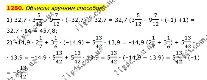 Обчисли зручним способом: 1) 32,7 · 35/12 – 97/12 · (–32,7) + 32,7 = 32,7 (35/12 – 97/12 · (–1) +1) = 32,7 · 14 = 457,8; 2) –14,9 · 21/7 + 31/6 · (–14,9) + 513/42 · 13,9 = –14,9 (21/7 + 31/6) + 513/42 · · 13,9 = –14,9 · 513/42 + 513/42 · 13,9 = 513/42 · (–14,9 + 13,9) = 513/42 · (–1) = –513/42.