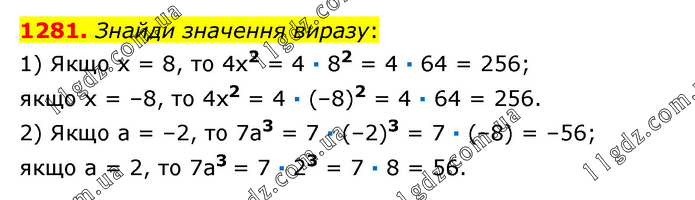 Знайди значення виразу: 1) Якщо х = 8, то 4х2 = 4 · 82 = 4 · 64 = 256; якщо х = –8, то 4х2 = 4 · (–8)2 = 4 · 64 = 256. 2) Якщо а = –2, то 7а3 = 7 · (–2)3 = 7 · (–8) = –56; якщо а = 2, то 7а3 = 7 · 23 = 7 · 8 = 56.