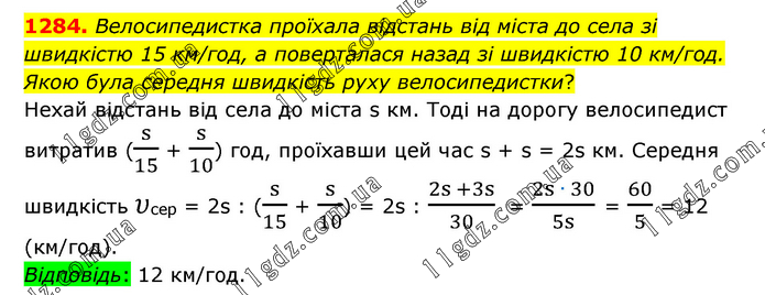 Велосипедистка проїхала відстань від міста до села зі швидкістю 15 км/год, а поверталася назад зі швидкістю 10 км/год. Якою була середня швидкість руху велосипедистки? Нехай відстань від села до міста s км. Тоді на дорогу велосипедист витратив (s/15 + s/10) год, проїхавши цей час s + s = 2s км. Середня швидкість υсер = 2s : (s/15 + s/10) = 2s : (2s +3s)/30 = (2s ∙ 30)/5s = 60/5 = 12 (км/год). Відповідь: 12 км/год.