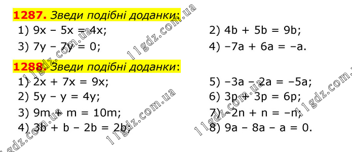 1287. Зведи подібні доданки: 1) 9x – 5x = 4x; 2) 4b + 5b = 9b; 3) 7y – 7y = 0; 4) –7а + 6а = –а. 1288. Зведи подібні доданки: 1) 2x + 7x = 9x; 5) –3a – 2a = –5a; 2) 5y – y = 4y; 6) 3p + 3p = 6p; 3) 9m + m = 10m; 7) –2n + n = –n; 4) 3b + b – 2b = 2b; 8) 9а – 8а – а = 0.