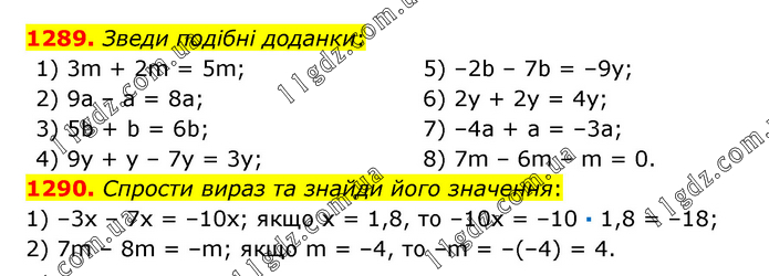 1289. Зведи подібні доданки: 1) 3m + 2m = 5m; 5) –2b – 7b = –9y; 2) 9a – a = 8a; 6) 2y + 2y = 4y; 3) 5b + b = 6b; 7) –4a + a = –3a; 4) 9y + y – 7y = 3y; 8) 7m – 6m – m = 0. 1290. Спрости вираз та знайди його значення: 1) –3x – 7x = –10x; якщо х = 1,8, то –10х = –10 · 1,8 = –18; 2) 7m – 8m = –m; якщо m = –4, то –m = –(–4) = 4.