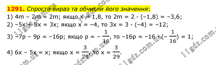 Спрости вираз та обчисли його значення: 1) 4m – 2m = 2m; якщо х = 1,8, то 2m = 2 · (–1,8) = –3,6; 2) –5x + 8x = 3x; якщо x = –4, то 3x = 3 · (–4) = –12; 3) –7p – 9p = –16p; якщо p = – 1/16, то –16p = –16 · (– 1/16) = 1; 4) 6х – 5х = х; якщо х = 3/29, то х = 3/29.