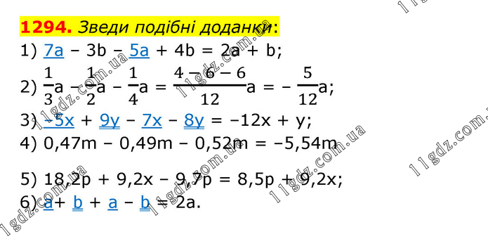 Зведи подібні доданки: 1) 7a – 3b – 5a + 4b = 2a + b; 2) 1/3a – 1/2a – 1/4a = (4 - 6 - 6)/12a = – 5/12a; 3) –5x + 9y – 7x – 8y = –12x + y; 4) 0,47m – 0,49m – 0,52m = –5,54m 5) 18,2p + 9,2x – 9,7p = 8,5p + 9,2x; 6) a+ b + a – b = 2a.