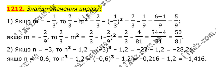 Знайди значення виразу: 1) Якщо m = – 1/3, то 2/3 – m2 = 2/3 – (–1/3)2 = 2/3 – 1/9 = (6-1)/9 = 5/9; якщо m = – 2/9, то 2/3 – m2 = 2/3 – (–2/9)2 = 2/3 – 4/81 = (54-4)/81 = 50/81. 2) Якщо n = –3, то n3 – 1,2 = (–3)3 – 1,2 = –27 – 1,2 = –28,2; якщо n = –0,6, то n3 – 1,2 = (–0,6)3 – 1,2 = –0,216 – 1,2 = –1,416.