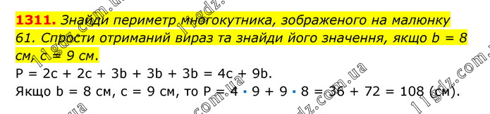 Знайди периметр многокутника, зображеного на малюнку 61. Спрости отриманий вираз та знайди його значення, якщо b = 8 см, с = 9 см. P = 2c + 2c + 3b + 3b + 3b = 4c + 9b. Якщо b = 8 см, с = 9 см, то Р = 4 · 9 + 9 · 8 = 36 + 72 = 108 (см).