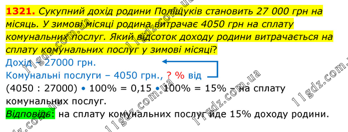 Сукупний дохід родини Поліщуків становить 27 000 грн на місяць. У зимові місяці родина витрачає 4050 грн на сплату комунальних послуг. Який відсоток доходу родини витрачається на сплату комунальних послуг у зимові місяці? Дохід – 27000 грн. Комунальні послуги – 4050 грн., ? % від (4050 : 27000) • 100% = 0,15 • 100% = 15% – на сплату комунальних послуг. Відповідь: на сплату комунальних послуг йде 15% доходу родини.