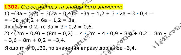 Спрости вираз та знайди його значення: 1) –(3а – 1,2) + 3(2а – 0,4) = –3а + 1,2 + 3 · 2а – 3 · 0,4 = = –3а + 1,2 + 6а – 1,2 = 3а. Якщо а = 0,2, то 3а = 3 · 0,2 = 0,6. 2) 4(2m – 0,9) – (8m – 0,2) = 4 · 2m – 4 · 0,9 – 8m + 0,2 = 8m – – 3,6 – 8m + 0,2 = –3,4. Якщо m = 0,132, то значення виразу дорівнює –3,4.