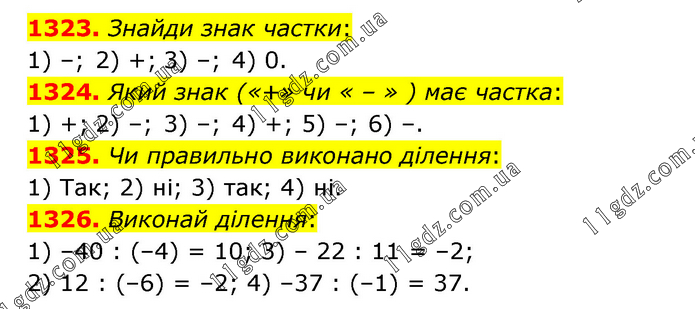 1323. Знайди знак частки: 1) –; 2) +; 3) –; 4) 0. 1324. Який знак («+» чи « – » ) має частка: 1) +; 2) –; 3) –; 4) +; 5) –; 6) –. 1325. Чи правильно виконано ділення: 1) Так; 2) ні; 3) так; 4) ні. 1326. Виконай ділення: 1) –40 : (–4) = 10; 3) – 22 : 11 = –2; 2) 12 : (–6) = –2; 4) –37 : (–1) = 37.
