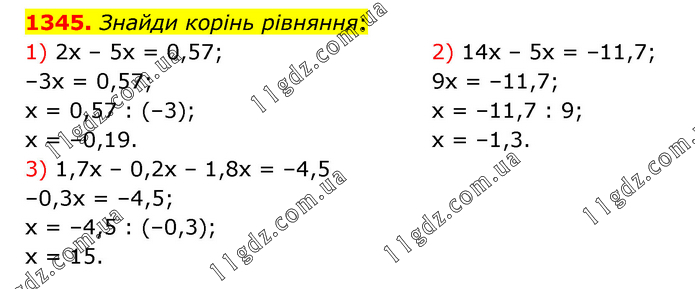 Знайди корінь рівняння: 1) 2х – 5х = 0,57; –3х = 0,57; х = 0,57 : (–3); х = –0,19. 2) 14х – 5х = –11,7; 9х = –11,7; х = –11,7 : 9; х = –1,3. 3) 1,7х – 0,2х – 1,8х = –4,5 –0,3х = –4,5; х = –4,5 : (–0,3); х = 15.