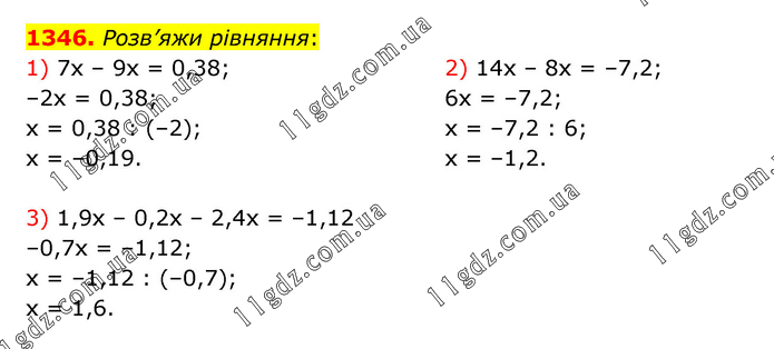 Розв’яжи рівняння: 1) 7х – 9х = 0,38; –2х = 0,38; х = 0,38 : (–2); х = –0,19. 2) 14х – 8х = –7,2; 6х = –7,2; х = –7,2 : 6; х = –1,2. 3) 1,9х – 0,2х – 2,4х = –1,12 –0,7х = –1,12; х = –1,12 : (–0,7); х = 1,6.