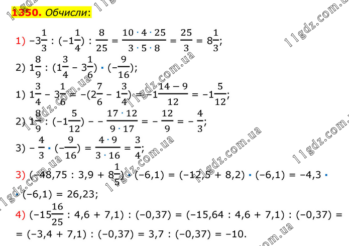 Обчисли: 1) –31/3 : (–11/4) : 8/25 = (10 ∙ 4 ∙ 25)/(3 ∙ 5 ∙ 8) = 25/3 = 81/3; 2) 18/9 : (13/4 – 31/6) · (–9/16); 1) 13/4 – 31/6 = –(27/6 – 13/4) = –1(14 - 9)/12 = –15/12; 2) 18/9 : (–15/12) – – (17 ∙ 12)/(9 ∙ 17) = – 12/9 = – 4/3; 3) – 4/3 · (–9/16) = (4 ∙ 9)/(3 ∙ 16) = 3/4; 3) (–48,75 : 3,9 + 81/5) · (–6,1) = (–12,5 + 8,2) · (–6,1) = –4,3 · · (–6,1) = 26,23; 4) (–1516/25 : 4,6 + 7,1) : (–0,37) = (–15,64 : 4,6 + 7,1) : (–0,37) = = (–3,4 + 7,1) : (–0,37) = 3,7 : (–0,37) = –10.