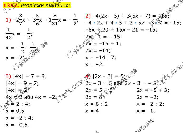 Розв’яжи рівняння: 1) –23/7х + 35/6х – 18/21х = – 1/2; 1/42х = – 1/2; х = – 1/2 : 1/42; х = –21. 2) –4(2х – 5) + 3(5х – 7) = –15; –4 · 2х + 4 · 5 + 3 · 5х – 3 · 7 = –15; –8х + 20 + 15х – 21 = –15; 7х – 1 = – 15; 7х = –15 + 1; 7х = –14; х = –14 : 7; х = –2. 3) |4x| + 7 = 9; |4x| = 9 – 7; |4x| = 2; 4х = 2 або 4х = –2; х = 2 : 4; х = 0,5 х = –2 : 4; х = –0,5. 4) |2x – 3| = 5; 2х – 3 = 5 або 2х – 3 = – 5; 2х = 5 + 3 2х = 8 х = 8 : 2 х = 4 2х = –5 + 3; 2х = –2; х = –2 : 2; х = –1.