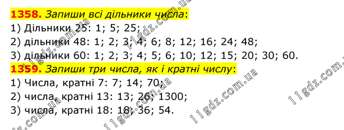 1358. Запиши всі дільники числа: 1) Дільники 25: 1; 5; 25; 2) дільники 48: 1; 2; 3; 4; 6; 8; 12; 16; 24; 48; 3) дільники 60: 1; 2; 3; 4; 5; 6; 10; 12; 15; 20; 30; 60. 1359. Запиши три числа, як і кратні числу: 1) Числа, кратні 7: 7; 14; 70; 2) числа, кратні 13: 13; 26; 1300; 3) числа, кратні 18: 18; 36; 54.