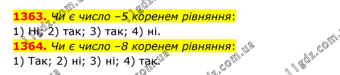 1363. Чи є число –5 коренем рівняння: 1) Ні; 2) так; 3) так; 4) ні. 1364. Чи є число –8 коренем рівняння: 1) Так; 2) ні; 3) ні; 4) так.