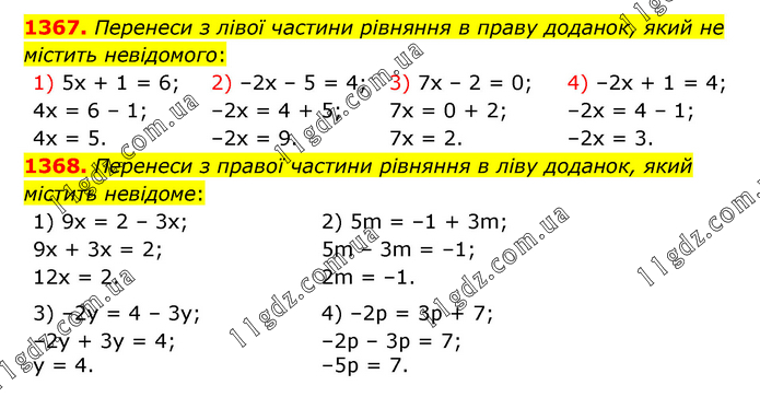 1367. Перенеси з лівої частини рівняння в праву доданок, який не містить невідомого: 1) 5х + 1 = 6; 4х = 6 – 1; 4х = 5. 2) –2х – 5 = 4; –2х = 4 + 5; –2х = 9. 3) 7х – 2 = 0; 7х = 0 + 2; 7х = 2. 4) –2х + 1 = 4; –2х = 4 – 1; –2х = 3. 1368. Перенеси з правої частини рівняння в ліву доданок, який містить невідоме: 1) 9х = 2 – 3х; 9х + 3х = 2; 12х = 2. 2) 5m = –1 + 3m; 5m – 3m = –1; 2m = –1. 3) –2y = 4 – 3y; –2y + 3y = 4; у = 4. 4) –2p = 3p + 7; –2p – 3p = 7; –5р = 7.