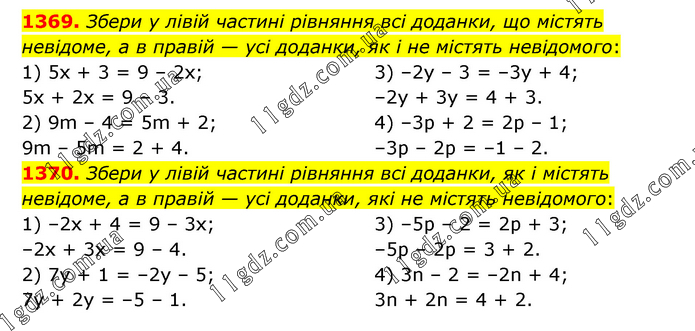 1369. Збери у лівій частині рівняння всі доданки, що містять невідоме, а в правій — усі доданки, як і не містять невідомого: 1) 5x + 3 = 9 – 2x; 5x + 2x = 9 – 3. 2) 9m – 4 = 5m + 2; 9m – 5m = 2 + 4. 3) –2y – 3 = –3y + 4; –2y + 3y = 4 + 3. 4) –3р + 2 = 2р – 1; –3р – 2р = –1 – 2. 1370. Збери у лівій частині рівняння всі доданки, як і містять невідоме, а в правій — усі доданки, які не містять невідомого: 1) –2x + 4 = 9 – 3x; –2x + 3x = 9 – 4. 2) 7y + 1 = –2y – 5; 7y + 2y = –5 – 1. 3) –5p – 2 = 2p + 3; –5p – 2p = 3 + 2. 4) 3n – 2 = –2n + 4; 3n + 2n = 4 + 2.