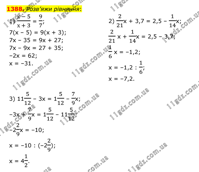 Розв’яжи рівняння: 1) (х - 5)/(х + 3) = 9/7; 7(х – 5) = 9(х + 3); 7х – 35 = 9х + 27; 7х – 9х = 27 + 35; –2х = 62; х = –31. 2) 2/21х + 3,7 = 2,5 – 1/14х; 2/21 х + 1/14х = 2,5 – 3,7; 1/6 х = –1,2; х = –1,2 : 1/6; х = –7,2. 3) 115/12 – 3х = 15/12 – 7/9х; –3х + 7/9х = 15/12 – 115/12; –22/9х = –10; х = –10 : (–22/9); х = 41/2.