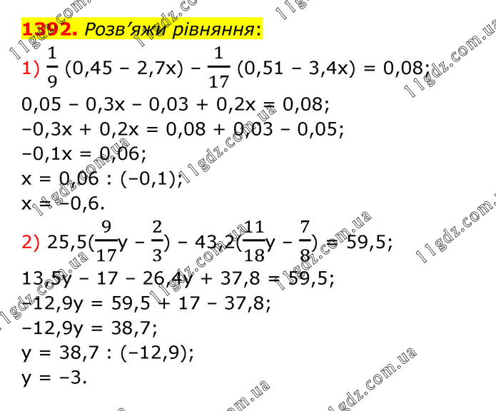 Розв’яжи рівняння: 1) 1/9 (0,45 – 2,7х) – 1/17 (0,51 – 3,4х) = 0,08; 0,05 – 0,3х – 0,03 + 0,2х = 0,08; –0,3х + 0,2х = 0,08 + 0,03 – 0,05; –0,1х = 0,06; х = 0,06 : (–0,1); х = –0,6. 2) 25,5(9/17у – 2/3) – 43,2(11/18у – 7/8) = 59,5; 13,5у – 17 – 26,4у + 37,8 = 59,5; –12,9у = 59,5 + 17 – 37,8; –12,9у = 38,7; у = 38,7 : (–12,9); у = –3.