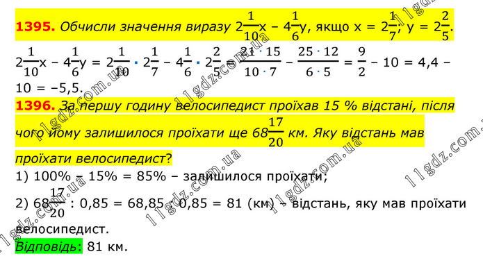 1395. Обчисли значення виразу 21/10х – 41/6у, якщо х = 21/7; у = 22/5. 21/10х – 41/6у = 21/10 · 21/7 – 41/6 · 22/5 = (21 ∙ 15)/(10 ∙ 7) – (25 ∙ 12)/(6 ∙ 5) = 9/2 – 10 = 4,4 – 10 = –5,5. 1396. За першу годину велосипедист проїхав 15 % відстані, після чого йому залишилося проїхати ще 6817/20 км. Яку відстань мав проїхати велосипедист? 1) 100% – 15% = 85% – залишилося проїхати; 2) 6817/20 : 0,85 = 68,85 : 0,85 = 81 (км) – відстань, яку мав проїхати велосипедист. Відповідь: 81 км.