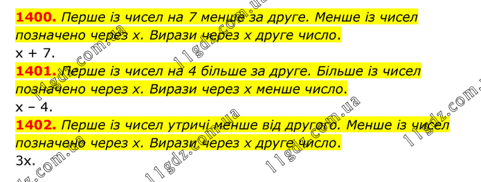 1400. Перше із чисел на 7 менше за друге. Менше із чисел позначено через х. Вирази через х друге число. х + 7. 1401. Перше із чисел на 4 більше за друге. Більше із чисел позначено через х. Вирази через х менше число. х – 4. 1402. Перше із чисел утричі менше від другого. Менше із чисел позначено через х. Вирази через х друге число. 3х.