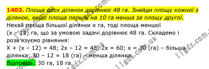 Площа двох ділянок дорівнює 48 га. Знайди площу кожної з ділянок, якщо площа першої на 10 га менша за площу другої. Нехай площа більшої ділянки х га, тоді площа меншої (х – 12) га, що за умовою задачі дорівнює 48 га. Складемо і розв’язуємо рівняння: Х + (х – 12) = 48; 2х – 12 = 48; 2х = 60; х = 30 (га) – більша ділянка; 30 – 12 = 18 (га) – менша ділянка. Відповідь: 30 га, 18 га.
