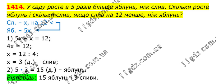 У саду росте в 5 разів більше яблунь, ніж слив. Скільки росте яблунь і скільки слив, якщо слив на 12 менше, ніж яблунь? Сл. – х, на 12 < Яб. – 5х 1) 5х – х = 12; 4х = 12; х = 12 : 4; х = 3 (д.) – слив; 2) 5 · 3 = 15 (д.) – яблунь. Відповідь: 15 яблунь і 3 сливи.