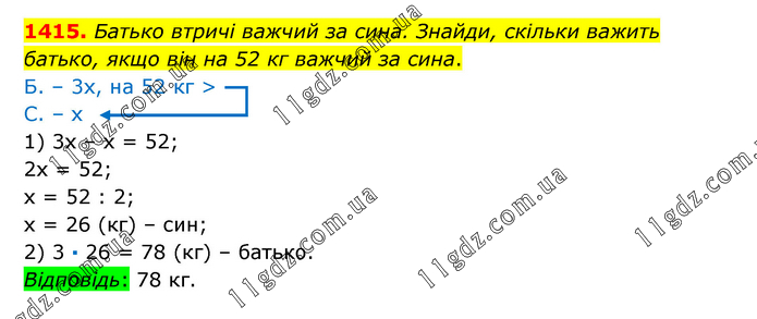 Батько втричі важчий за сина. Знайди, скільки важить батько, якщо він на 52 кг важчий за сина. Б. – 3х, на 52 кг > С. – х 1) 3х – х = 52; 2х = 52; х = 52 : 2; х = 26 (кг) – син; 2) 3 · 26 = 78 (кг) – батько. Відповідь: 78 кг.