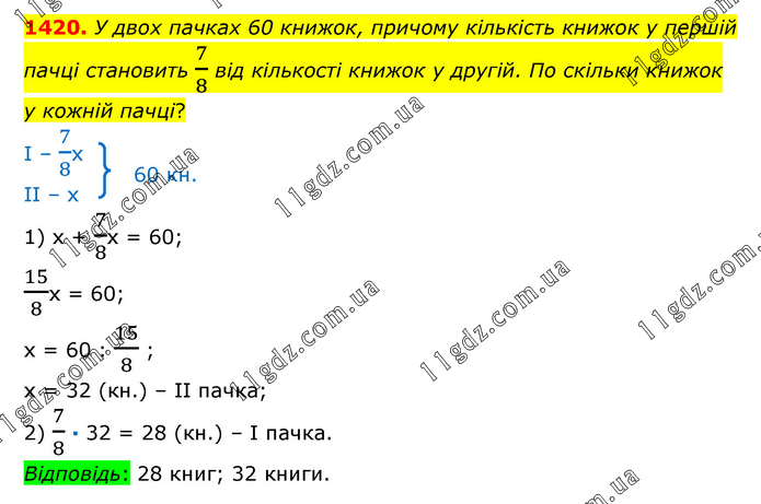 У двох пачках 60 книжок, причому кількість книжок у першій пачці становить 7/8 від кількості книжок у другій. По скільки книжок у кожній пачці? І – 7/8х ІІ – х 1) х + 7/8х = 60; 15/8х = 60; х = 60 : 15/8 ; х = 32 (кн.) – ІІ пачка; 2) 7/8 · 32 = 28 (кн.) – І пачка. Відповідь: 28 книг; 32 книги.