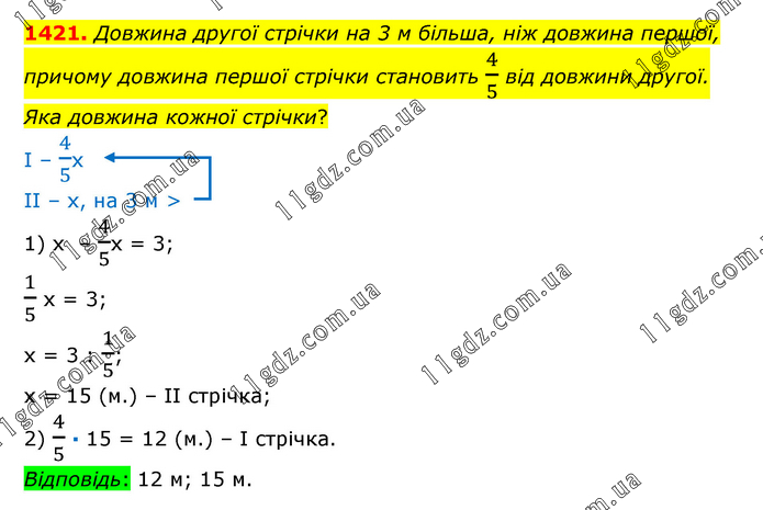 Довжина другої стрічки на 3 м більша, ніж довжина першої, причому довжина першої стрічки становить 4/5 від довжини другої. Яка довжина кожної стрічки? І – 4/5х ІІ – х, на 3 м > 1) х – 4/5х = 3; 1/5 х = 3; х = 3 : 1/5; х = 15 (м.) – ІІ стрічка; 2) 4/5 · 15 = 12 (м.) – І стрічка. Відповідь: 12 м; 15 м.