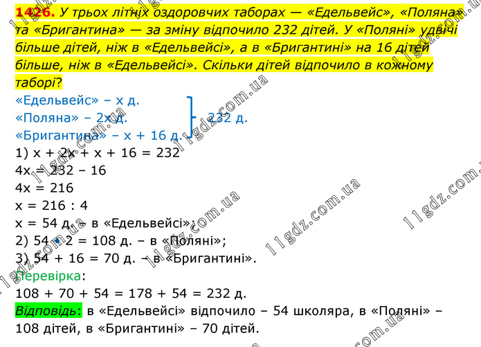 У трьох літніх оздоровчих таборах — «Едельвейс», «Поляна» та «Бригантина» — за зміну відпочило 232 дітей. У «Поляні» удвічі більше дітей, ніж в «Едельвейсі», а в «Бригантині» на 16 дітей більше, ніж в «Едельвейсі». Скільки дітей відпочило в кожному таборі? «Едельвейс» – х д. «Поляна» – 2х д. 232 д. «Бригантина» – х + 16 д. 1) х + 2х + х + 16 = 232 4х = 232 – 16 4х = 216 х = 216 : 4 х = 54 д. – в «Едельвейсі»; 2) 54 • 2 = 108 д. – в «Поляні»; 3) 54 + 16 = 70 д. – в «Бригантині». Перевірка: 108 + 70 + 54 = 178 + 54 = 232 д. Відповідь: в «Едельвейсі» відпочило – 54 школяра, в «Поляні» – 108 дітей, в «Бригантині» – 70 дітей.