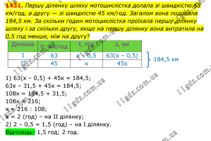 Першу ділянку шляху мотоциклістка долала зі швидкістю 63 км/год, а другу — зі швидкістю 45 км/год. Загалом вона подолала 184,5 км. За скільки годин мотоциклістка проїхала першу ділянку шляху і за скільки другу, якщо на першу ділянку вона витратила на 0,5 год менше, ніж на другу? 1) 63(х – 0,5) + 45х = 184,5; 63х – 31,5 + 45х = 184,5; 108х = 184,5 + 31,5; 108х = 216; х = 216 : 108; х = 2 (год) – на ІІ ділянку; 2) 2 – 0,5 = 1,5 (год) – на І ділянку. Відповідь: 1,5 год; 2 год.