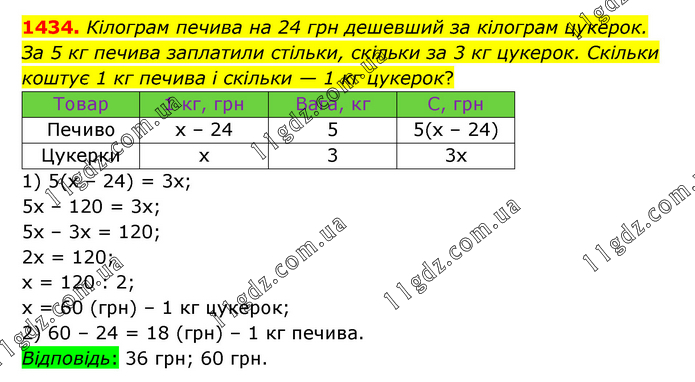 Кілограм печива на 24 грн дешевший за кілограм цукерок. За 5 кг печива заплатили стільки, скільки за 3 кг цукерок. Скільки коштує 1 кг печива і скільки — 1 кг цукерок? 1) 5(х – 24) = 3х; 5х – 120 = 3х; 5х – 3х = 120; 2х = 120; х = 120 : 2; х = 60 (грн) – 1 кг цукерок; 2) 60 – 24 = 18 (грн) – 1 кг печива. Відповідь: 36 грн; 60 грн.