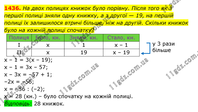 На двох полицях книжок було порівну. Після того як з першої полиці зняли одну книжку, а з другої — 19, на першій полиці їх залишилося втричі більше, ніж на другій. Скільки книжок було на кожній полиці спочатку? х – 1 = 3(х – 19); х – 1 = 3х – 57; х – 3х = –57 + 1; –2х = –56; х = –56 : (–2); х = 28 (кн.) – було спочатку на кожній полиці. Відповідь: 28 книжок.
