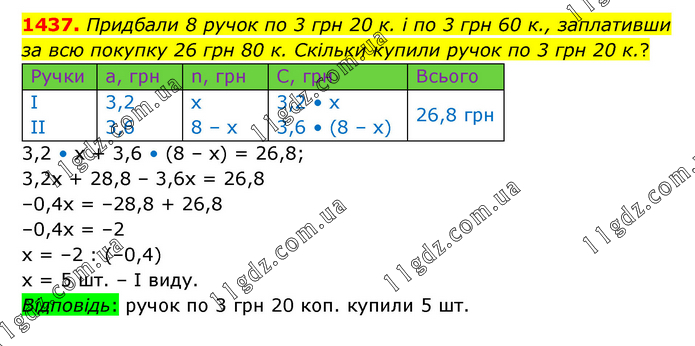 Придбали 8 ручок по 3 грн 20 к. і по 3 грн 60 к., заплативши за всю покупку 26 грн 80 к. Скільки купили ручок по 3 грн 20 к.? 3,2 • х + 3,6 • (8 – х) = 26,8; 3,2х + 28,8 – 3,6х = 26,8 –0,4х = –28,8 + 26,8 –0,4х = –2 х = –2 : (–0,4) х = 5 шт. – І виду. Відповідь: ручок по 3 грн 20 коп. купили 5 шт.