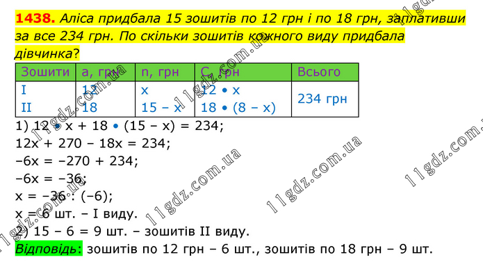 Аліса придбала 15 зошитів по 12 грн і по 18 грн, заплативши за все 234 грн. По скільки зошитів кожного виду придбала дівчинка? 1) 12 • х + 18 • (15 – х) = 234; 12х + 270 – 18х = 234; –6х = –270 + 234; –6х = –36; х = –36 : (–6); х = 6 шт. – І виду. 2) 15 – 6 = 9 шт. – зошитів ІІ виду. Відповідь: зошитів по 12 грн – 6 шт., зошитів по 18 грн – 9 шт.