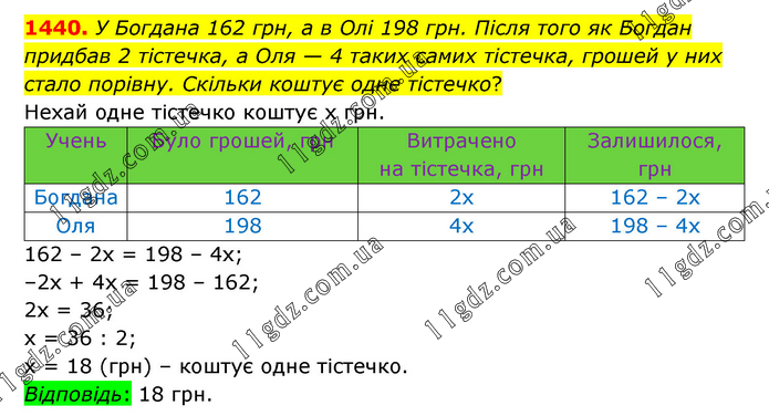 У Богдана 162 грн, а в Олі 198 грн. Після того як Богдан придбав 2 тістечка, а Оля — 4 таких самих тістечка, грошей у них стало порівну. Скільки коштує одне тістечко? Нехай одне тістечко коштує х грн. 162 – 2х = 198 – 4х; –2х + 4х = 198 – 162; 2х = 36; х = 36 : 2; х = 18 (грн) – коштує одне тістечко. Відповідь: 18 грн.