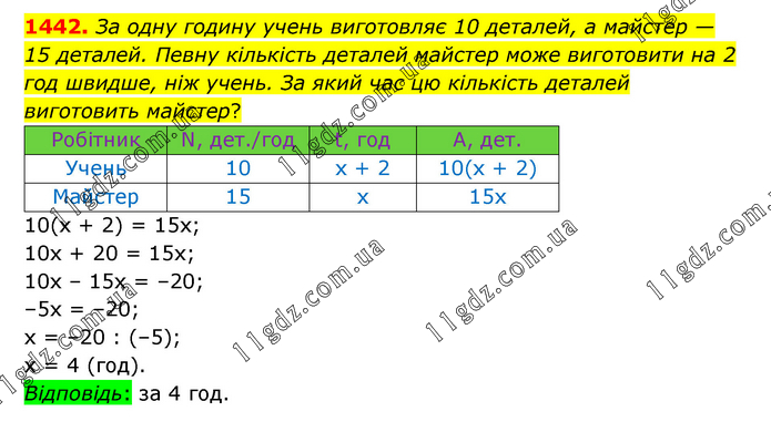 За одну годину учень виготовляє 10 деталей, а майстер — 15 деталей. Певну кількість деталей майстер може виготовити на 2 год швидше, ніж учень. За який час цю кількість деталей виготовить майстер? 10(х + 2) = 15х; 10х + 20 = 15х; 10х – 15х = –20; –5х = –20; х = –20 : (–5); х = 4 (год). Відповідь: за 4 год